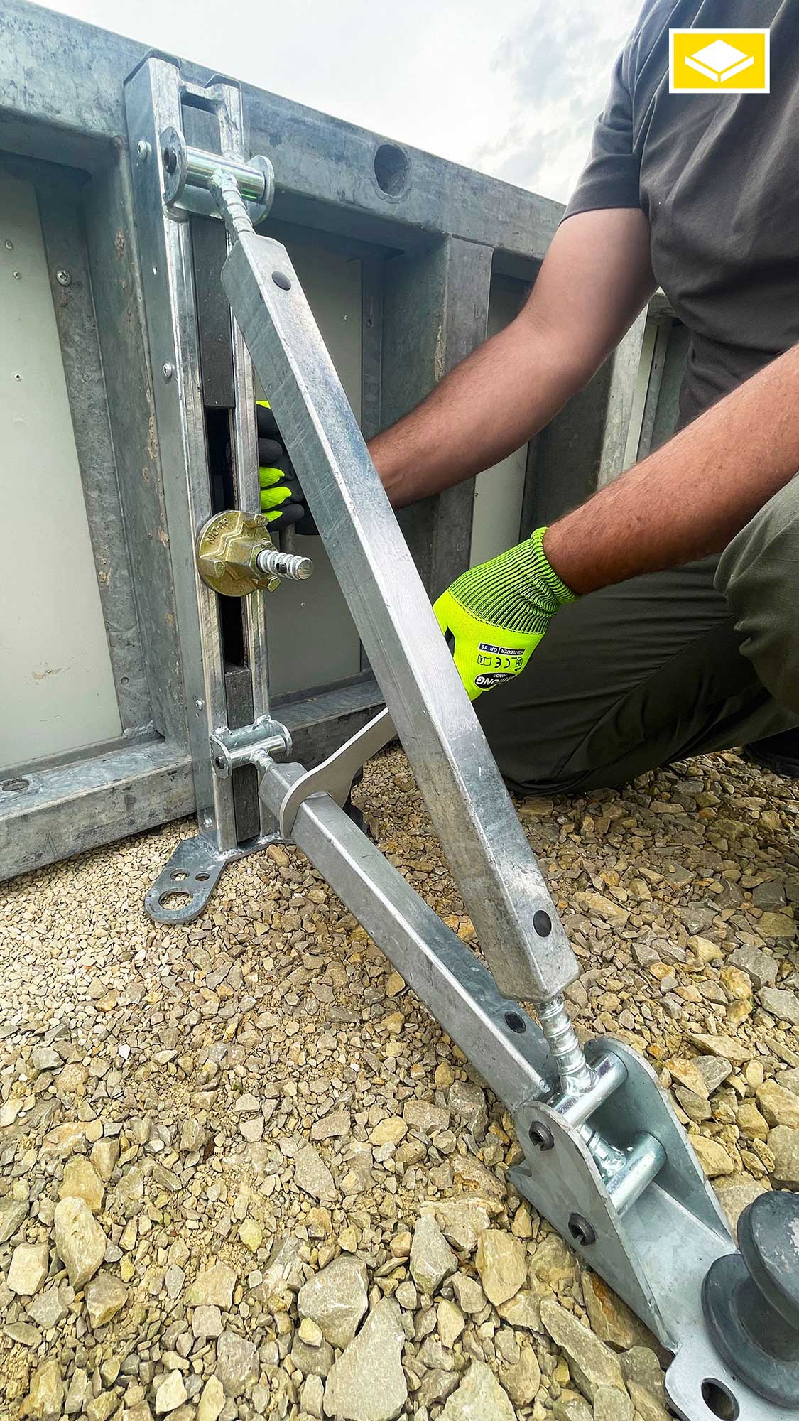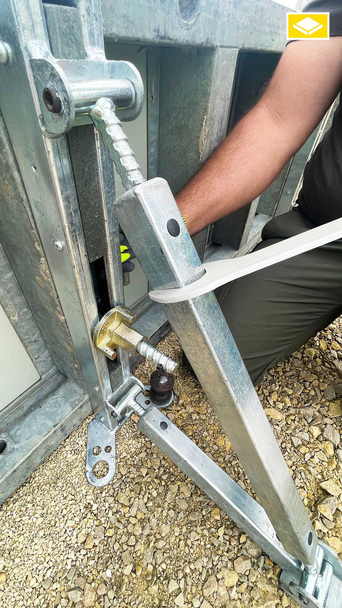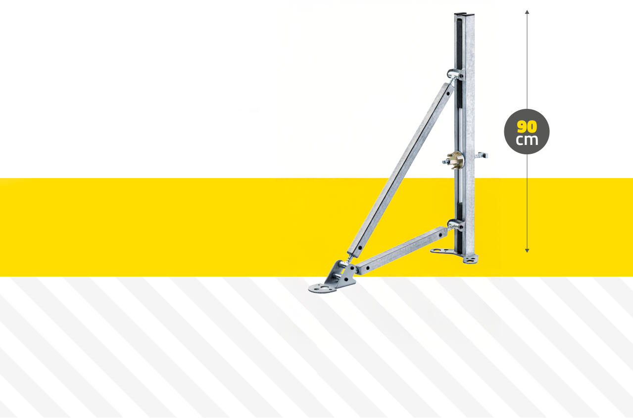 Wo Bodenplatten betoniert werden, ist die Aufstellfläche für die Abstützung häufig uneben oder hat sogar Gefälle. Für solche Fälle können Sie den hinteren Fuß bequem um bis zu 20 cm in der Höhe verstellen (jeweils 10 cm nach oben oder nach unten).